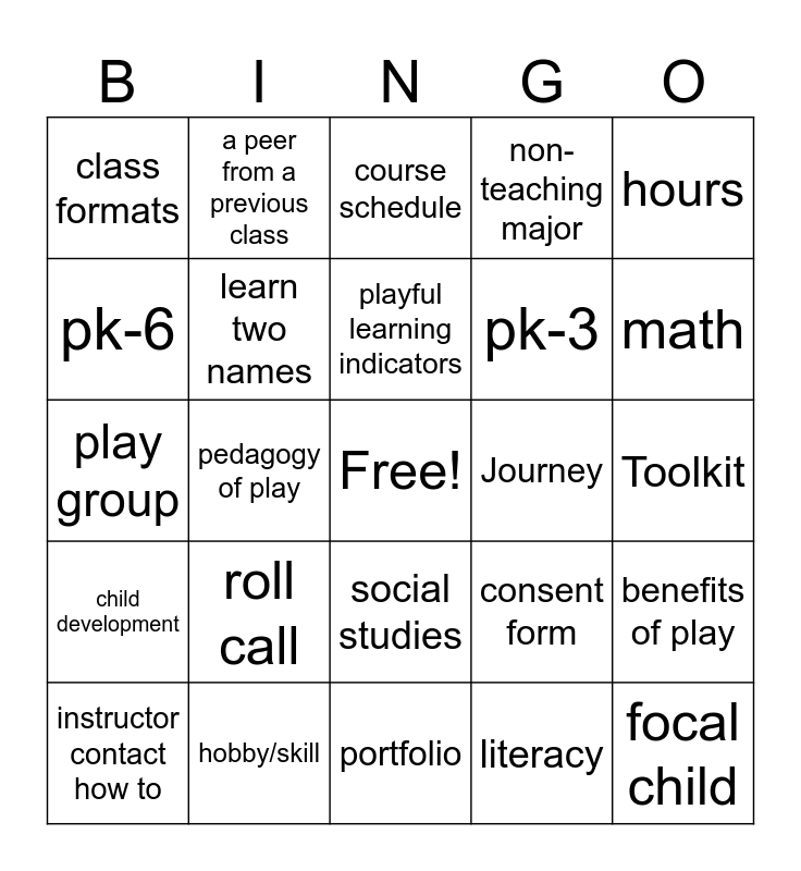 This bingo card has a free space and 29 words: instructor contact how to, field work, pedagogy of play, participation policy, class formats, course schedule, learn two names, roll call, Journey, hobby/skill, Toolkit, focal child, portfolio, literacy, math, science, social studies, child development, hours, play group, consent form, adult play, pk-3, pk-6, non-teaching major, a peer from a previous class, benefits of play, playful learning indicators and where is homework?.