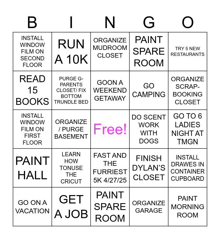 This bingo card has a free space and 24 words: LEARN HOW TONUSE THE CRICUT, GET A JOB, GOON A WEEKEND GETAWAY, GO ON A VACATION, TRY 5 NEW RESTAURANTS, INSTALL WINDOW FILM ON SECOND FLOOR, READ 15 BOOKS, RUN A 10K, DO SCENT WORK WITH DOGS, FAST AND THE FURRIEST 5K 4/27/25, GO CAMPING, INSTALL WINDOW FILM ON FIRST FLOOR, FINISH DYLAN’S CLOSET, INSTALL DRAWES IN CONTAINER CUPBOARD, PURGE G-PARENTS CLOSET/ FIX BOTTOM TRUNDLE BED, ORGANIZE GARAGE, GO TO 6 LADIES NIGHT AT TMGN, ORGANIZE MUDROOM CLOSET, ORGANIZE SCRAP- BOOKING CLOSET, ORGANIZE / PURGE BASEMENT, PAINT MORNING ROOM, PAINT HALL, PAINT SPARE ROOM and PAINT SPARE ROOM.