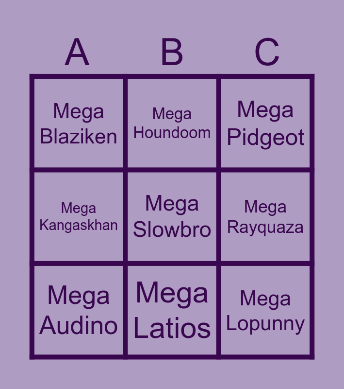 This bingo card has 45 words: Free!, Mega Venusaur, Mega Charizard X, Mega Charizard Y, Mega Blastoise, Mega Beedrill, Mega Pidgeot, Mega Alakazam, Mega Slowbro, Mega Gengar, Mega Kangaskhan, Mega Pinsir, Mega Gyarados, Mega Aerodactyl, Mega Mewtwo X, Mega Mewtwo Y, Mega Ampharos, Mega Steelix, Mega Scizor, Mega Heracross, Mega Houndoom, Mega Tyranitar, Mega Sceptile, Mega Blaziken, Mega Swampert, Mega Gardevoir, Mega Mawile, Mega Aggron, Mega Medicham, Mega Manectric, Mega Sharpedo, Mega Camerupt, Mega Altaria, Mega Banette, Mega Absol, Mega Glalie, Mega Salamence, Mega Metagross, Mega Latias, Mega Latios, Mega Rayquaza, Mega Lopunny, Mega Gallade, Mega Audino and Mega Diancie.