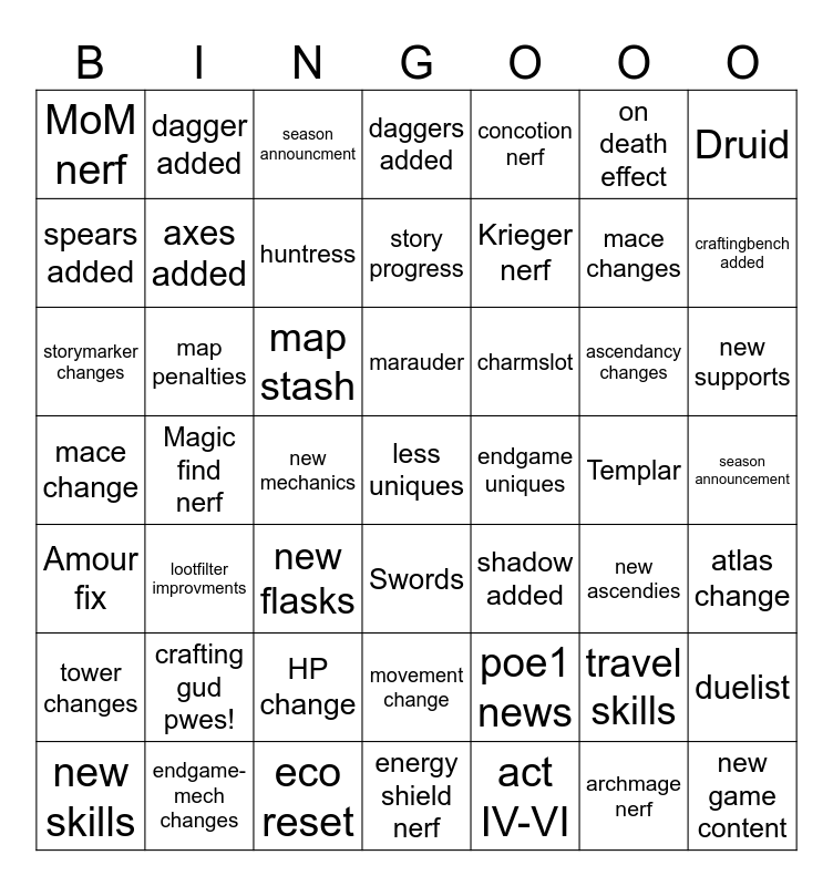 This bingo card has a free space and 48 words: Amour fix, Magic find nerf, eco reset, Swords, Krieger nerf, Templar, Druid, new skills, map penalties, new mechanics, daggers added, concotion nerf, ascendancy changes, new supports, mace change, crafting gud pwes!, season announcment, marauder, poe1 news, on death effect, craftingbench added, spears added, dagger added, huntress, act IV-VI, mace changes, season announcement, tower changes, lootfilter improvments, map stash, movement change, charmslot, travel skills, duelist, MoM nerf, endgame-mech changes, new flasks, energy shield nerf, endgame uniques, archmage nerf, atlas change, storymarker changes, axes added, HP change, story progress, shadow added, new ascendies and new game content.
