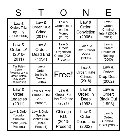This bingo card has a free space and 24 words: Law & Order (1990-2010; 2022-Present), Law & Order: Special Victims Unit (1990-Present), Law & Order: Organized Crime (2021-Present), Law & Order Toronto: Criminal Intent (2024-Present), Law & Order: Criminal Intent (2001-2011), Law & Order: Trial by Jury (2005-2006), Law & Order: LA (2010-2011), Law & Order True Crime (2017), Law & Order: Hate Crimes (2018), Law & Order: For the Defense (2021), Exiled: A Law & Order Movie (1998), The Paley Center Presents Law & Order: Before They Were Stars (2020), Law & Order: In Deep (1993), Law & Order: Black Out (1993), Law & Order: Dead End (1994), Law & Order: Dead Line (2002), Law & Order: Drop Dead (2002), Law & Order: Dead on the Money (2002), Law & Order: Double or Nothing (2003), Law & Order: Justice Is Served (2004), Law & Order: Criminal Intent (2006), Law & Order: Legacies (2011), Law & Order: Conviction (2006) and Chicago P.D. (2013-Present).