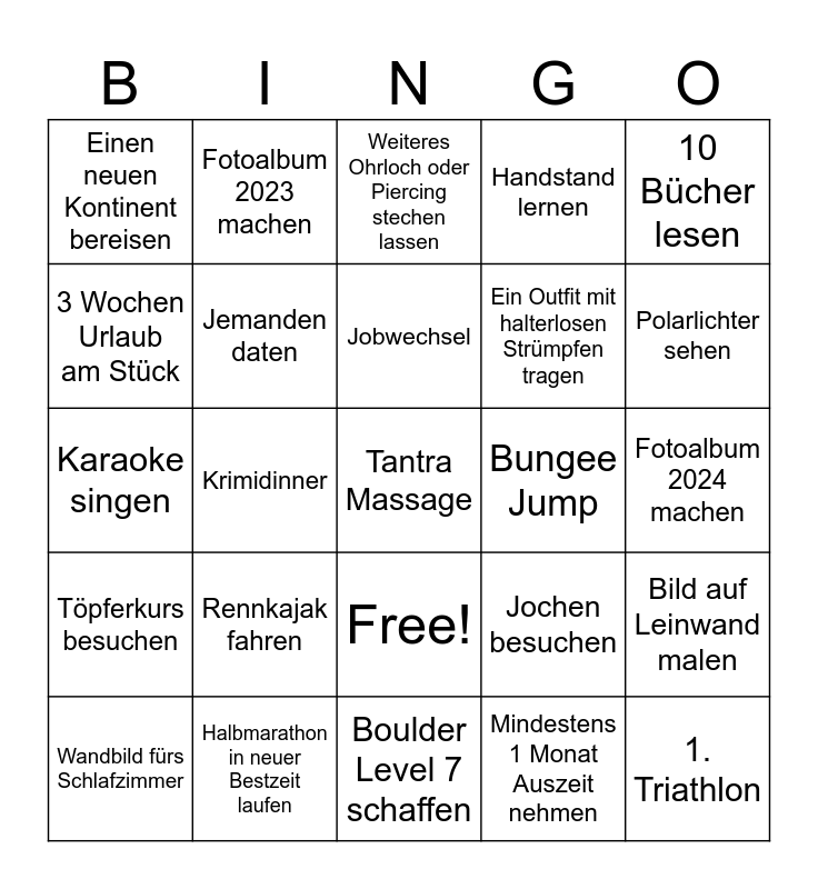 This bingo card has 26 words: Free!, Mindestens 1 Monat Auszeit nehmen, Jobwechsel, Halbmarathon in neuer Bestzeit laufen, 10 Bücher lesen, Einen neuen Kontinent bereisen, 3 Wochen Urlaub am Stück, Fotoalbum 2023 machen, Fotoalbum 2024 machen, Jochen besuchen, Ein Outfit mit halterlosen Strümpfen tragen, Karaoke singen, Bild auf Leinwand malen, Wandbild fürs Schlafzimmer, Krimidinner, Escape Game, Handstand lernen, Töpferkurs besuchen, Weiteres Ohrloch oder Piercing stechen lassen, Tantra Massage, Polarlichter sehen, Boulder Level 7 schaffen, Bungee Jump, Rennkajak fahren, Jemanden daten and 1. Triathlon.
