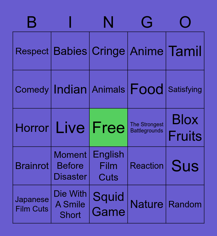 This bingo card has a free space and 24 words: Japanese Film Cuts, Moment Before Disaster, Animals, Nature, Tamil, Respect, Babies, Cringe, The Strongest Battlegrounds, Blox Fruits, Horror, Indian, Reaction, Sus, Comedy, Die With A Smile Short, Squid Game, Anime, Satisfying, Brainrot, Live, English Film Cuts, Food and Random.