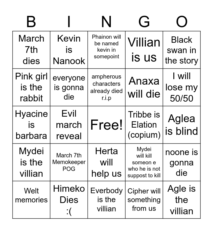 This bingo card has a free space and 24 words: March 7th Memokeeper POG, Himeko Dies :(, ampherous characters already died r.i.p, Welt memories, Black swan in the story, March 7th dies, Pink girl is the rabbit, Kevin is Nanook, Tribbe is Elation (copium), Herta will help us, Anaxa will die, Hyacine is barbara, Mydei will kill someon e who he is not suppost to kill, noone is gonna die, everyone is gonna die, Cipher will something from us, Aglea is blind, Phainon will be named kevin in somepoint, I will lose my 50/50, Evil march reveal, Agle is the villian, Mydei is the villian, Villian is us and Everbody is the villian.