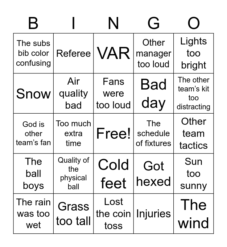 This bingo card has a free space and 24 words: Quality of the physical ball, Grass too tall, Fans were too loud, The rain was too wet, Lights too bright, The subs bib color confusing, Snow, Referee, The schedule of fixtures, Cold feet, Bad day, God is other team’s fan, Got hexed, Sun too sunny, Air quality bad, Injuries, Other team tactics, VAR, The other team’s kit too distracting, Too much extra time, The wind, The ball boys, Other manager too loud and Lost the coin toss.