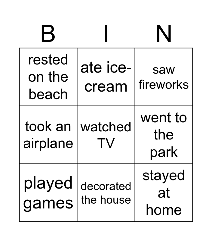 This bingo card has a free space and 8 words: went to the park, saw fireworks, ate ice-cream, played games, rested on the beach, stayed at home, took an airplane and decorated the house.