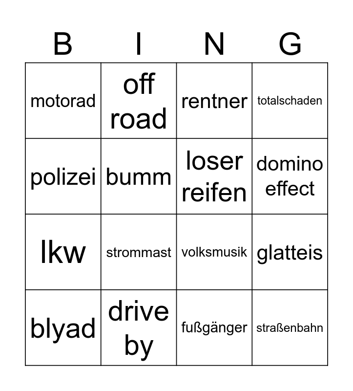 This bingo card has 16 words: drive by, glatteis, rentner, motorad, lkw, off road, volksmusik, fußgänger, polizei, bumm, blyad, totalschaden, strommast, domino effect, loser reifen and straßenbahn.