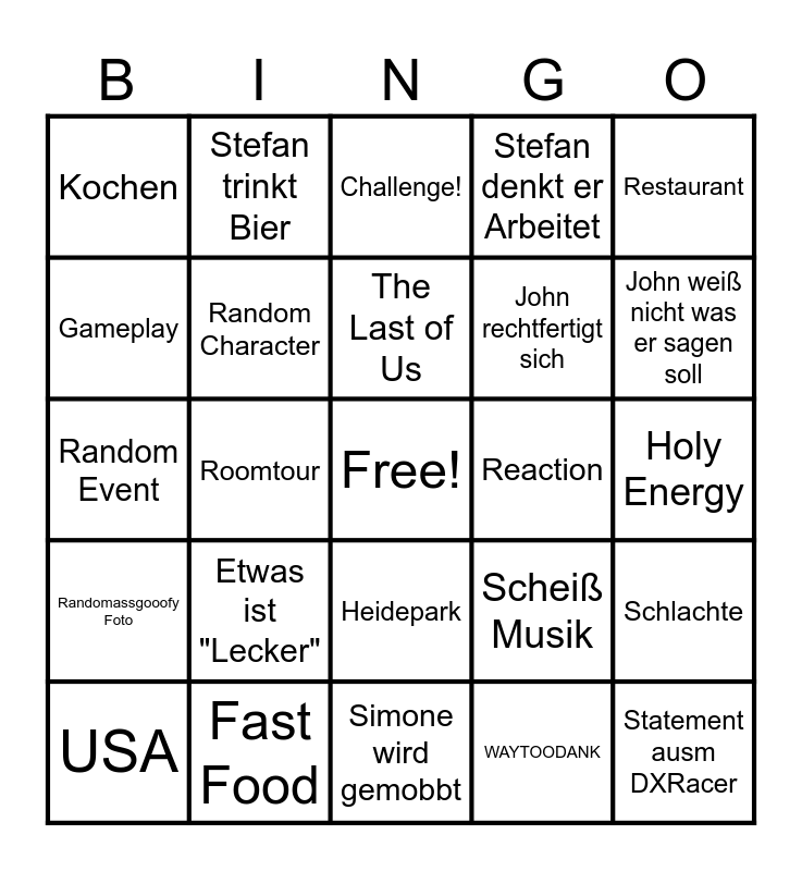 This bingo card has a free space and 25 words: Etwas ist "Lecker", Simone wird gemobbt, The Last of Us, USA, Restaurant, Kochen, Gameplay, Stefan trinkt Bier, Reaction, Heidepark, John rechtfertigt sich, Random Event, Scheiß Musik, Schlachte, Random Character, XXXTENTACION er Lept, Holy Energy, Challenge!, John weiß nicht was er sagen soll, Roomtour, Statement ausm DXRacer, Fast Food, Randomassgooofy Foto, Stefan denkt er Arbeitet and WAYTOODANK.