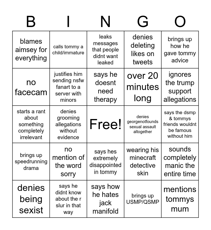 This bingo card has a free space and 24 words: no mention of the word sorry, says he didnt know about the r slur in that way, says he doesnt need therapy, denies being sexist, brings up how he gave tommy advice, blames aimsey for everything, no facecam, calls tommy a child/immature, denies georgenotfounds sexual assault altogether, says hes extremely disappointed in tommy, over 20 minutes long, starts a rant about something completely irrelevant, wearing his minecraft detective skin, sounds completely manic the entire time, justifies him sending nsfw fanart to a server with minors, brings up USMP/QSMP, says the dsmp & tommys friends wouldnt be famous without him, leaks messages that people didnt want leaked, ignores the trump support allegations, denies grooming allegations without evidence, mentions tommys mum, brings up speedrunning drama, denies deleting likes on tweets and says how he hates jack manifold.