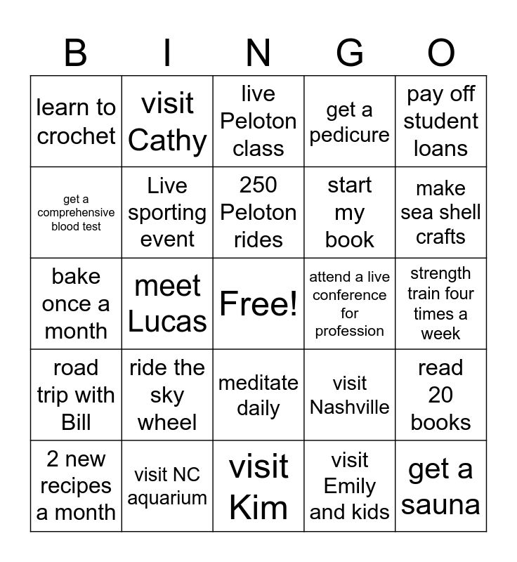 This bingo card has a free space and 24 words: ride the sky wheel, visit NC aquarium, 250 Peloton rides, 2 new recipes a month, pay off student loans, learn to crochet, get a comprehensive blood test, visit Cathy, attend a live conference for profession, meditate daily, start my book, bake once a month, visit Nashville, read 20 books, Live sporting event, visit Emily and kids, strength train four times a week, live Peloton class, make sea shell crafts, meet Lucas, get a sauna, road trip with Bill, get a pedicure and visit Kim.