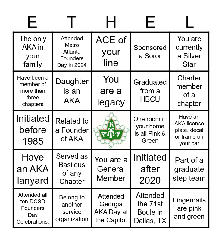 This bingo card has a free space and 24 words: Served as Basileus of any Chapter, Belong to another service organization, You are a legacy, Attended all ten DCSD Founders Day Celebrations., You are currently a Silver Star, The only AKA in your family, Have been a member of more than three chapters, Attended Metro Atlanta Founders Day in 2024, One room in your home is all Pink & Green, You are a General Member, Graduated from a HBCU, Initiated before 1985, Initiated after 2020, Part of a graduate step team, Daughter is an AKA, Attended the 71st Boule in Dallas, TX, Have an AKA license plate, decal or frame on your car, ACE of your line, Charter member of a chapter, Related to a Founder of AKA, Fingernails are pink and green, Have an AKA lanyard, Sponsored a Soror and Attended Georgia AKA Day at the Capitol.