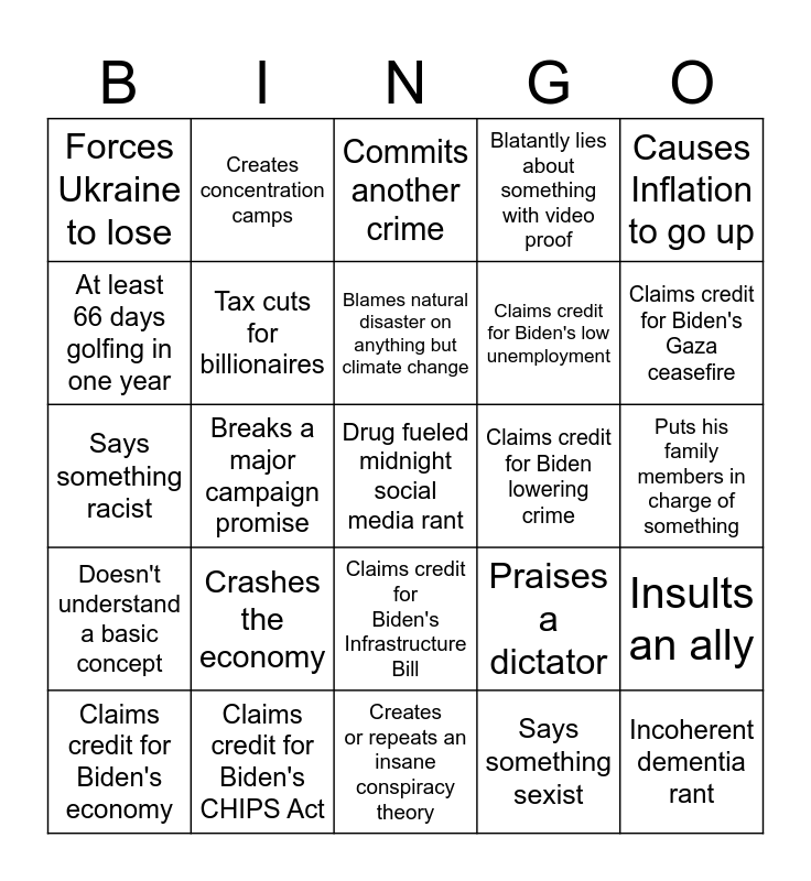 This bingo card has a free space and 24 words: Crashes the economy, Claims credit for Biden's CHIPS Act, Blames natural disaster on anything but climate change, Claims credit for Biden's economy, Causes Inflation to go up, Forces Ukraine to lose, At least 66 days golfing in one year, Creates concentration camps, Claims credit for Biden lowering crime, Claims credit for Biden's Infrastructure Bill, Claims credit for Biden's low unemployment, Says something racist, Praises a dictator, Insults an ally, Tax cuts for billionaires, Says something sexist, Puts his family members in charge of something, Commits another crime, Claims credit for Biden's Gaza ceasefire, Breaks a major campaign promise, Incoherent dementia rant, Doesn't understand a basic concept, Blatantly lies about something with video proof and Creates or repeats an insane conspiracy theory.