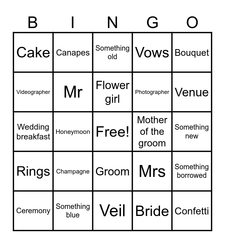 This bingo card has a free space and 36 words: Husband, Wife, Wedding dress, Mr, Mrs, Rings, Flower girl, Bridesmaid, Bouquet, Gifts, Honeymoon, Vows, Mother of the bride, Mother of the groom, Venue, Cake, First dance, Champagne, Confetti, Something old, Something new, Something borrowed, Something blue, Ceremony, Veil, Canapes, Wedding breakfast, Speeches, Photographer, Videographer, Make-up artist, Hair stylist, Bride, Groom, Saxophone and Singer.