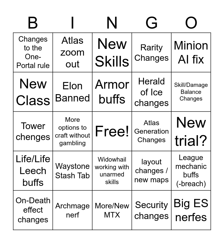 This bingo card has a free space and 24 words: Waystone Stash Tab, Archmage nerf, Armor buffs, On-Death effect changes, Minion AI fix, Changes to the One-Portal rule, New Class, Atlas zoom out, Atlas Generation Changes, Widowhail working with unarmed skills, Herald of Ice changes, Tower chenges, layout changes / new maps, League mechanic buffs (-breach), Elon Banned, Security changes, New trial?, New Skills, Skill/Damage Balance Changes, More options to craft without gambling, Big ES nerfes, Life/Life Leech buffs, Rarity Changes and More/New MTX.