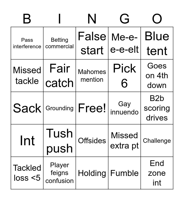 This bingo card has a free space and 29 words: Tackled loss <5, &goal, Grounding, &inches, Pass interference, False start, Fair catch, Tush push, Gay innuendo, Player feigns confusion, B2b scoring drives, End zone int, Holding, Fumble, Goes on 4th down, Delay of game, Offsides, Int, Blue tent, Sack, Missed extra pt, Face mask, Pick 6, Missed tackle, Me-e-e-e-elt, Betting commercial, Challenge, Mahomes mention and QB rushing TD.
