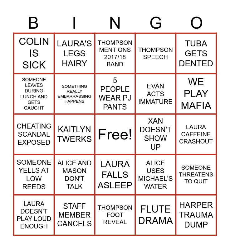 This bingo card has a free space and 39 words: SOMEONE CRIES, HARPER GETS MAD, MASON ROLLS HIS EYES AT LAURA, SOMETHING REALLY EMBARRASSING HAPPENS, LAURA DOESN'T PLAY LOUD ENOUGH, LAURA FALLS ASLEEP, 5 PEOPLE WEAR PJ PANTS, GROSS DINNER, TUBA GETS DENTED, SOMEONE YELLS AT LOW REEDS, KAITLYN TWERKS, THOMPSON SPEECH, HARPER TRAUMA DUMP, LAURA CAFFEINE CRASHOUT, XAN DOESN'T SHOW UP, ALICE AND MASON DON'T TALK, AMELIA USES GROSS REED, COLIN IS SICK, FRESHMAN GETS LOST DURING SECTIONALS, ALICE USES MICHAEL'S WATER, SOMEONE LEAVES DURING LUNCH AND GETS CAUGHT, THOMPSON FOOT REVEAL, EVAN ACTS IMMATURE, WE PLAY MAFIA, KAITLYN IS PANTSED, LAURA IS PANTSED, BONES TAKE PHOTOS IN THE BATHROOM, SOMEONE BREAKS UP, SOMEONE GETS TOGETHER, LAURA'S LEGS HAIRY, MICHAEL BREAKS ENGLISH HORN, ALICE PLAYS BY HERSELF, THOMPSON MENTIONS 2017/18 BAND, STAFF MEMBER CANCELS, FLUTE DRAMA, PARKING LOT FENDER BENDER, SOMEONE THREATENS TO QUIT, CHEATING SCANDAL EXPOSED and RAINY WEATHER.