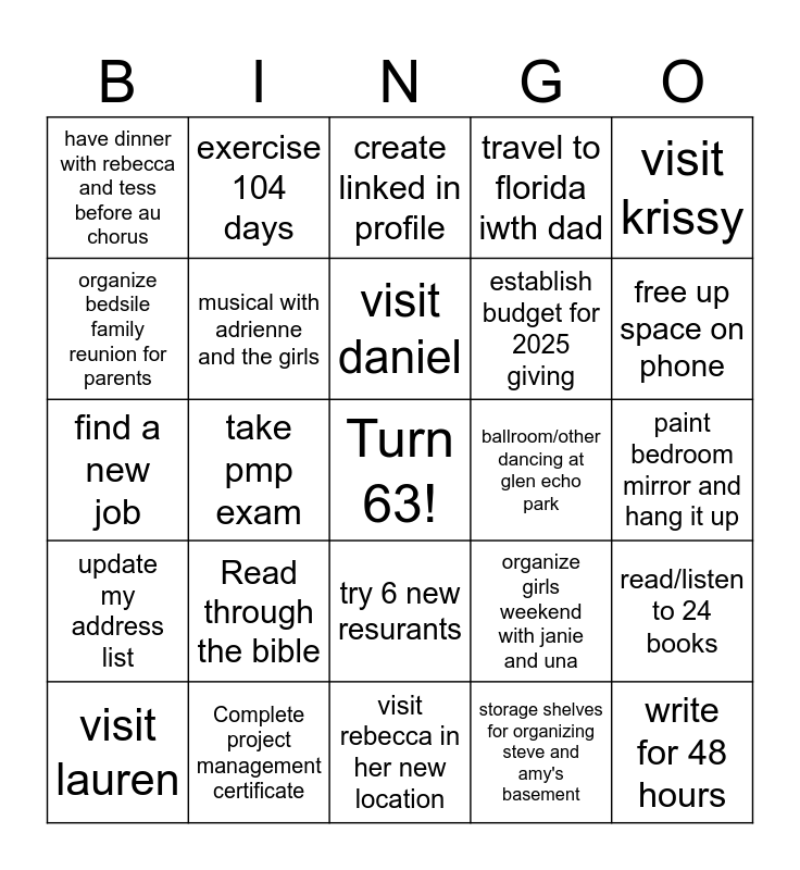 This bingo card has a free space and 24 words: Read through the bible, Complete project management certificate, visit daniel, visit lauren, visit krissy, have dinner with rebecca and tess before au chorus, organize bedsile family reunion for parents, exercise 104 days, ballroom/other dancing at glen echo park, try 6 new resurants, establish budget for 2025 giving, find a new job, organize girls weekend with janie and una, read/listen to 24 books, musical with adrienne and the girls, storage shelves for organizing steve and amy's basement, paint bedroom mirror and hang it up, create linked in profile, free up space on phone, take pmp exam, write for 48 hours, update my address list, travel to florida iwth dad and visit rebecca in her new location.