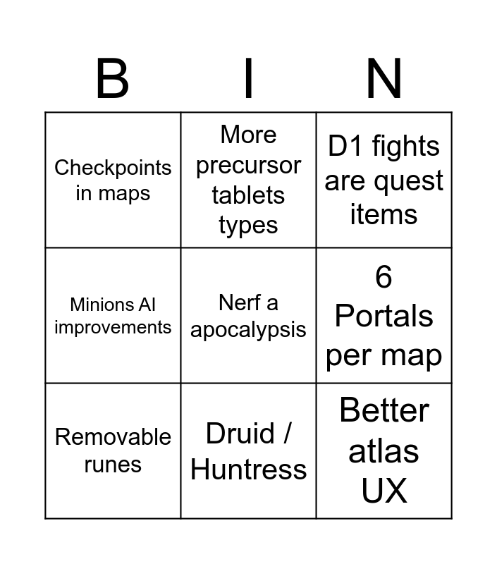 This bingo card has a free space and 8 words: 6 Portals per map, D1 fights are quest items, More precursor tablets types, Removable runes, Checkpoints in maps, Better atlas UX, Minions AI improvements and Druid / Huntress.