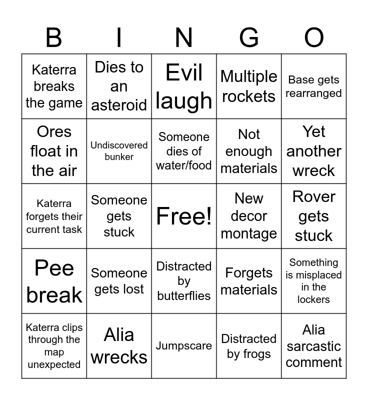 This bingo card has a free space and 24 words: Someone gets lost, Alia wrecks, Someone dies of water/food, Katerra clips through the map unexpected, Base gets rearranged, Katerra breaks the game, Ores float in the air, Dies to an asteroid, New decor montage, Distracted by butterflies, Not enough materials, Katerra forgets their current task, Forgets materials, Something is misplaced in the lockers, Undiscovered bunker, Distracted by frogs, Rover gets stuck, Evil laugh, Yet another wreck, Someone gets stuck, Alia sarcastic comment, Pee break, Multiple rockets and Jumpscare.