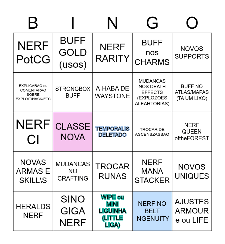 This bingo card has a free space and 29 words: HERALDS NERF, NOVO FARM, CLASSE NOVA, NERF BLINK, NERF PotCG, NERF RARITY, STRONGBOX BUFF, MUDANCAS NO CRAFTING, TROCAR DE ASCENSZASSAO, SINO GIGA NERF, NERF QUEEN oftheFOREST, AJUSTES ARMOUR e ou LIFE, WIPE ou MINI LIGUINHA (LITTLE LIGA), NERF NO BELT INGENUITY, BUFF NO ATLAS/MAPAS (TA UM LIXO), BUFFS GENERALIZADOS NAS SKILLS POUCO USADAS, TROCAR RUNAS, NOVAS ARMAS E SKILL\S, NOVOS SUPPORTS, NERF CI, NERF MANA STACKER, BURNING GROUND DELETADO SOME LIXO, MUDANCAS NOS DEATH EFFECTS (EXPLOZOES ALEAHTORIAS), EXPLICARAO ou COMENTARAO SOBRE EXPLOIT/HACK/ETC, BUFF nos CHARMS, BUFF GOLD (usos), NOVOS UNIQUES, A-HABA DE WAYSTONE and FILTRO NO CONSOLE.