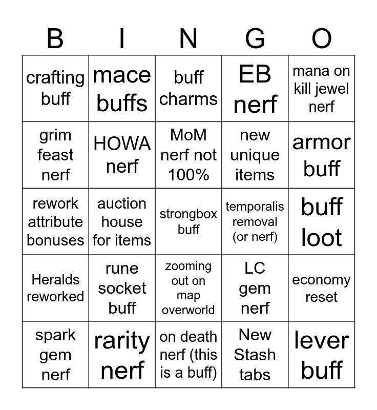 This bingo card has a free space and 34 words: Archmage nerf, New Stash tabs, Blink nerf, Fire spells buffed, Heralds reworked, HOWA nerf, mana on kill jewel nerf, spark gem nerf, mace buffs, es % on tree nerf, MoM nerf not 100%, buff charms, everlasting gaze, 6 portals (buff), temporalis removal (or nerf), armor buff, rarity nerf, rework attribute bonuses, rune socket buff, LC gem nerf, zooming out on map overworld, new league mechanic, crafting buff, buff loot, on death nerf (this is a buff), lever buff, EB nerf, new gems, new unique items, grim feast nerf, barrier invocation nerf, auction house for items, economy reset and breach nerf.