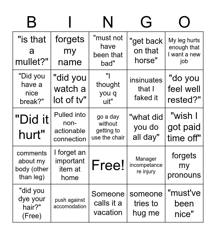 This bingo card has 26 words: Free!, someone tries to hug me, "I thought you quit", push against accomodation, My leg hurts enough that I want a new job, "is that a mullet?", "Did you have a nice break?", forgets my name, "wish I got paid time off", Manager incompetance re injury, insinuates that I faked it, "Did it hurt", forgets my pronouns, "did you dye your hair?" (Free), Pulled into non-actionable connection, sarcastic welcome back, "get back on that horse", comments about my body (other than leg), "must not have been that bad", go a day without getting to use the chair, "do you feel well rested?", Someone calls it a vacation, "what did you do all day", I forget an important item at home, "did you watch a lot of tv" and "must've been nice".