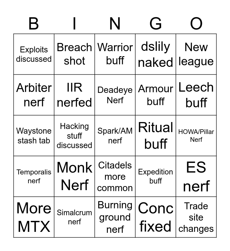 This bingo card has a free space and 24 words: Monk Nerf, Simalcrum nerf, Deadeye Nerf, More MTX, New league, Exploits discussed, Arbiter nerf, Breach shot, Ritual buff, Citadels more common, Armour buff, Waystone stash tab, Expedition buff, ES nerf, IIR nerfed, Conc fixed, HOWA/Pillar Nerf, Warrior buff, Leech buff, Hacking stuff discussed, Trade site changes, Temporalis nerf, dslily naked and Burning ground nerf.