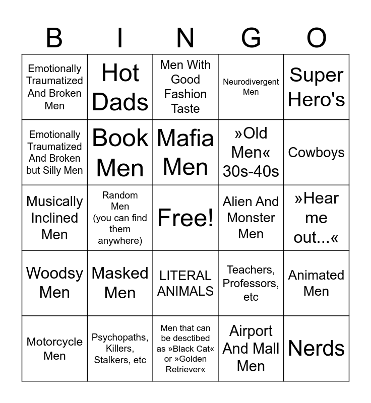 This bingo card has a free space and 24 words: Masked Men, Psychopaths, Killers, Stalkers, etc, Mafia Men, Motorcycle Men, Super Hero's, Emotionally Traumatized And Broken Men, Emotionally Traumatized And Broken but Silly Men, Hot Dads, Alien And Monster Men, LITERAL ANIMALS, »Old Men« 30s-40s, Musically Inclined Men, Teachers, Professors, etc, Animated Men, Book Men, Airport And Mall Men, »Hear me out...«, Men With Good Fashion Taste, Cowboys, Random Men (you can find them anywhere), Nerds, Woodsy Men, Neurodivergent Men and Men that can be desctibed as »Black Cat« or »Golden Retriever«.