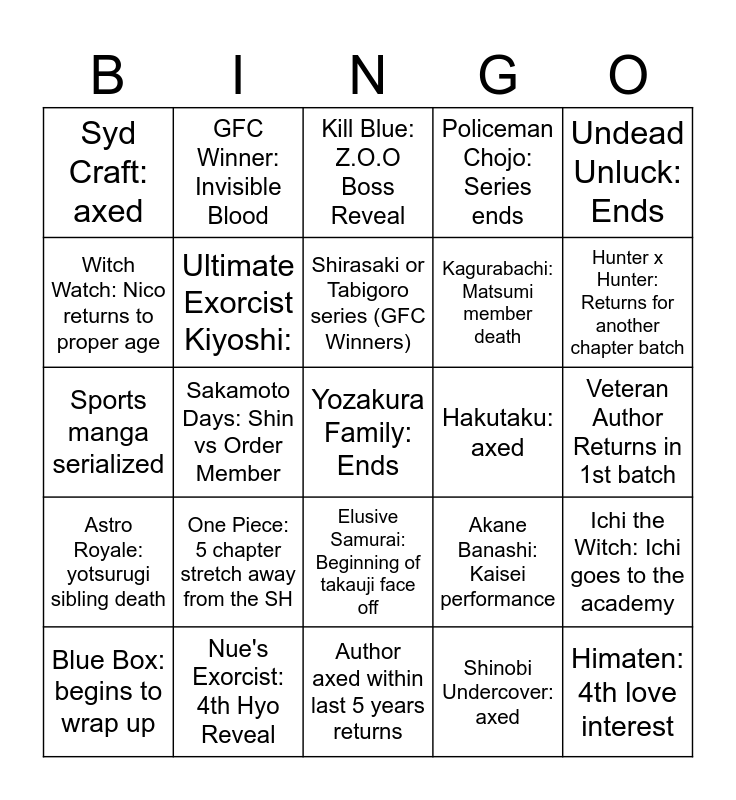 This bingo card has a free space and 24 words: One Piece: 5 chapter stretch away from the SH, Nue's Exorcist: 4th Hyo Reveal, Shirasaki or Tabigoro series (GFC Winners), Blue Box: begins to wrap up, Undead Unluck: Ends, Syd Craft: axed, Witch Watch: Nico returns to proper age, GFC Winner: Invisible Blood, Hakutaku: axed, Elusive Samurai: Beginning of takauji face off, Kagurabachi: Matsumi member death, Sports manga serialized, Akane Banashi: Kaisei performance, Ichi the Witch: Ichi goes to the academy, Ultimate Exorcist Kiyoshi:, Shinobi Undercover: axed, Veteran Author Returns in 1st batch, Kill Blue: Z.O.O Boss Reveal, Hunter x Hunter: Returns for another chapter batch, Sakamoto Days: Shin vs Order Member, Himaten: 4th love interest, Astro Royale: yotsurugi sibling death, Policeman Chojo: Series ends and Author axed within last 5 years returns.