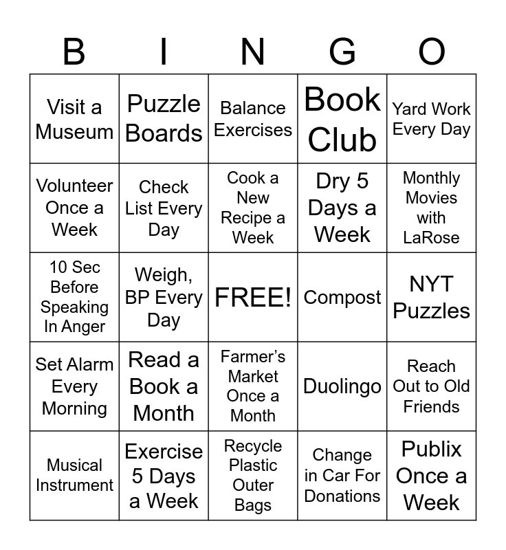This bingo card has a free space and 24 words: Read a Book a Month, Exercise 5 Days a Week, Cook a New Recipe a Week, Musical Instrument, Yard Work Every Day, Visit a Museum, Volunteer Once a Week, Puzzle Boards, Compost, Farmer’s Market Once a Month, Dry 5 Days a Week, 10 Sec Before Speaking In Anger, Duolingo, Reach Out to Old Friends, Check List Every Day, Change in Car For Donations, NYT Puzzles, Balance Exercises, Monthly Movies with LaRose, Weigh, BP Every Day, Publix Once a Week, Set Alarm Every Morning, Book Club and Recycle Plastic Outer Bags.