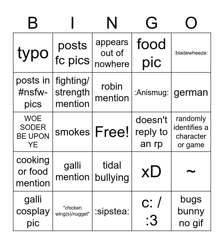 This bingo card has a free space and 24 words: galli mention, "chicken wing(s)/nugget", robin mention, galli cosplay pic, :bladewheeze:, typo, posts in #nsfw-pics, posts fc pics, doesn't reply to an rp, tidal bullying, :Anismug:, WOE SODER BE UPON YE, xD, ~, fighting/ strength mention, c: / :3, randomly identifies a character or game, appears out of nowhere, german, smokes, bugs bunny no gif, cooking or food mention, food pic and :sipstea:.