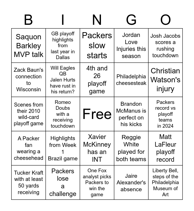 This bingo card has a free space and 24 words: Highlights from Week 1 Brazil game, Packers lose a challenge, 4th and 26 playoff game, Tucker Kraft with at least 50 yards receiving, Josh Jacobs scores a rushing touchdown, Saquon Barkley MVP talk, Zack Baun's connection to Wisconsin, GB playoff highlights from last year in Dallas, Brandon McManus is perfect on his kicks, Xavier McKinney has an INT, Philadelphia cheesesteak, Scenes from their 2010 wild-card playoff game, Reggie White played for both teams, Matt LaFleur playoff record, Will Eagles QB Jalen Hurts have rust in his return?, Jaire Alexander's absence, Packers record vs playoff teams in 2024, Packers slow starts, Christian Watson's injury, Romeo Doubs with a receiving touchdown, Liberty Bell, steps of the Philadelphia Museum of Art, A Packer fan wearing a cheesehead, Jordan Love Injuries this season and One Fox analyst picks Packers to win the game.