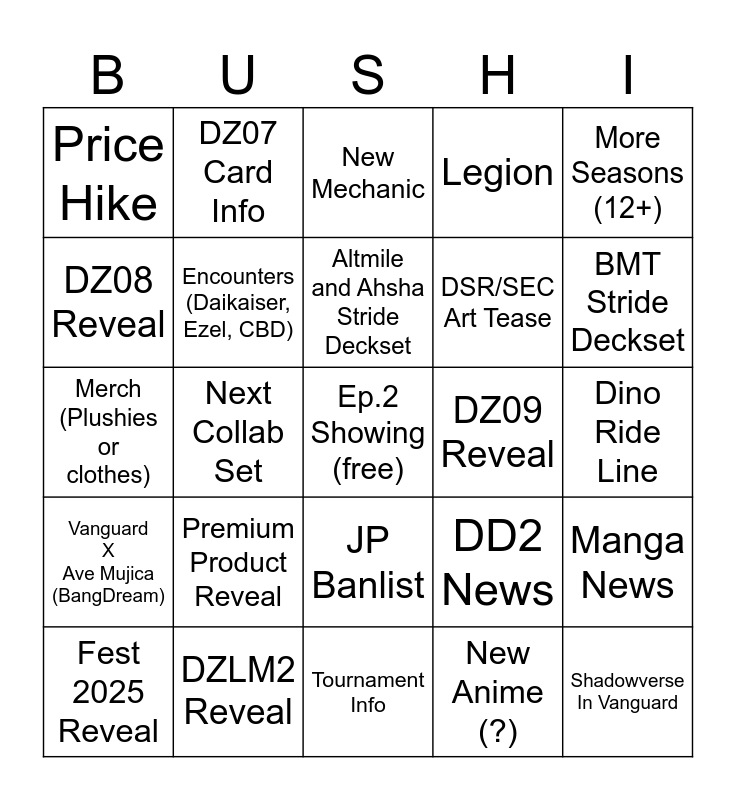 This bingo card has a free space and 24 words: Premium Product Reveal, DZLM2 Reveal, Altmile and Ahsha Stride Deckset, Fest 2025 Reveal, More Seasons (12+), Price Hike, DZ08 Reveal, DZ07 Card Info, DZ09 Reveal, JP Banlist, DSR/SEC Art Tease, Merch (Plushies or clothes), DD2 News, Manga News, Encounters (Daikaiser, Ezel, CBD), New Anime (?), Dino Ride Line, New Mechanic, BMT Stride Deckset, Next Collab Set, Shadowverse In Vanguard, Vanguard X Ave Mujica (BangDream), Legion and Tournament Info.