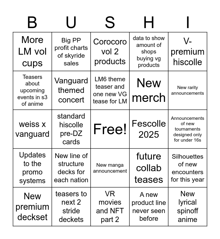 This bingo card has a free space and 24 words: New line of structure decks for each nation, teasers to next 2 stride deckets, LM6 theme teaser and one new VG tease for LM, New premium deckset, V-premium hiscolle, More LM vol cups, Teasers about upcoming events in s3 of anime, Big PP profit charts of skyride sales, Fescolle 2025, New manga announcement, New merch, weiss x vanguard, future collab teases, Silhouettes of new encounters for this year, Vanguard themed concert, A new product line never seen before, Announcements of new tournaments designed only for under 16s, Corocoro vol 2 products, New rarity announcements, standard hiscolle pre-DZ cards, New lyrical spinoff anime, Updates to the promo systems, data to show amount of shops buying vg products and VR movies and NFT part 2.