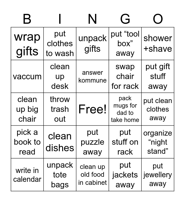 This bingo card has a free space and 24 words: clean dishes, unpack tote bags, answer kommune, write in calendar, shower +shave, wrap gifts, vaccum, put clothes to wash, pack mugs for dad to take home, put puzzle away, swap chair for rack, clean up big chair, put stuff on rack, organize “night stand”, clean up desk, put jackets away, put clean clothes away, unpack gifts, put gift stuff away, throw trash out, put jewellery away, pick a book to read, put “tool box” away and clean up old food in cabinet.
