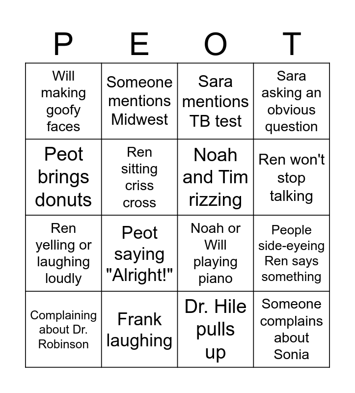 This bingo card has 16 words: Frank laughing, People side-eyeing Ren says something, Sara mentions TB test, Will making goofy faces, Ren yelling or laughing loudly, Someone mentions Midwest, Noah or Will playing piano, Dr. Hile pulls up, Peot brings donuts, Ren sitting criss cross, Complaining about Dr. Robinson, Sara asking an obvious question, Peot saying "Alright!", Ren won't stop talking, Noah and Tim rizzing and Someone complains about Sonia.