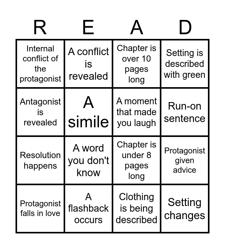 This bingo card has 23 words: Setting changes, A new character introduced, Run-on sentence, Imagery, Antagonist is revealed, Internal conflict of the protagonist, A simile, A conflict is revealed, Protagonist falls in love, Dialogue, A word you don't know, Resolution happens, Static/flat character introduced, Alliteration, A flashback occurs, The chapter ends with a question, Chapter is over 10 pages long, Chapter is under 8 pages long, A moment that made you laugh, Protagonist given advice, Setting is described with green, Clothing is being described and Age of character is stated.