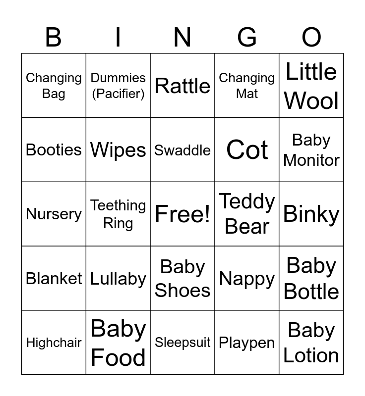 This bingo card has a free space and 27 words: Nappy, Pram, Cot, Sleepsuit, Booties, Rattle, Dummies (Pacifier), Blanket, Teddy Bear, Baby Bottle, Nursery, Changing Mat, Highchair, Baby Food, Baby Monitor, Car Seat, Wipes, Swaddle, Lullaby, Changing Bag, Binky, Playpen, Teething Ring, Baby Lotion, Baby Shoes, Little Wool and Little Scouser.