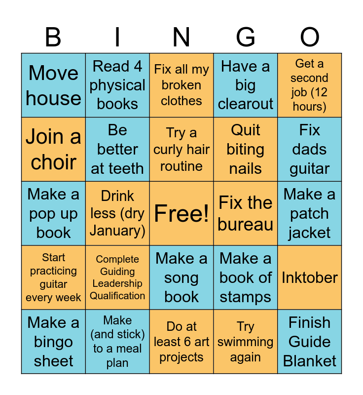 This bingo card has a free space and 24 words: Complete Guiding Leadership Qualification, Make (and stick) to a meal plan, Try a curly hair routine, Make a bingo sheet, Get a second job (12 hours), Move house, Join a choir, Read 4 physical books, Fix the bureau, Make a song book, Quit biting nails, Make a pop up book, Make a book of stamps, Inktober, Be better at teeth, Try swimming again, Make a patch jacket, Fix all my broken clothes, Fix dads guitar, Drink less (dry January), Finish Guide Blanket, Start practicing guitar every week, Have a big clearout and Do at least 6 art projects.