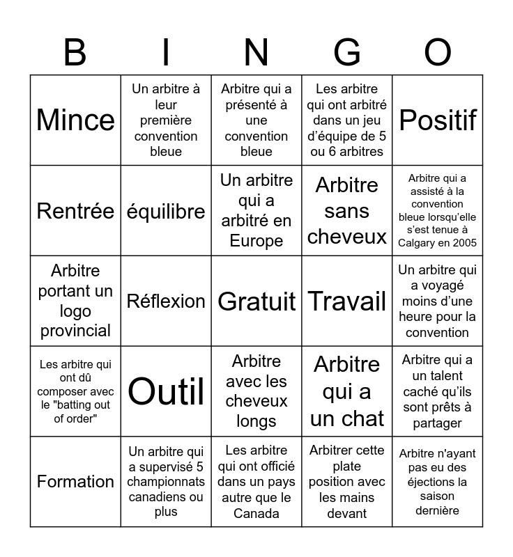 This bingo card has a free space and 24 words: Outil, Un arbitre qui a supervisé 5 championnats canadiens ou plus, Un arbitre qui a arbitré en Europe, Formation, Positif, Mince, Rentrée, Un arbitre à leur première convention bleue, Travail, Arbitre avec les cheveux longs, Arbitre sans cheveux, Arbitre portant un logo provincial, Arbitre qui a un chat, Arbitre qui a un talent caché qu’ils sont prêts à partager, équilibre, Arbitrer cette plate position avec les mains devant, Un arbitre qui a voyagé moins d’une heure pour la convention, Arbitre qui a présenté à une convention bleue, Arbitre qui a assisté à la convention bleue lorsqu’elle s’est tenue à Calgary en 2005, Réflexion, Arbitre n'ayant pas eu des éjections la saison dernière, Les arbitre qui ont dû composer avec le "batting out of order", Les arbitre qui ont arbitré dans un jeu d’équipe de 5 ou 6 arbitres and Les arbitre qui ont officié dans un pays autre que le Canada.