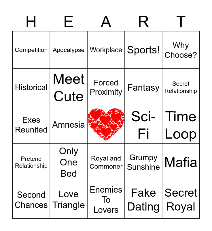 This bingo card has a free space and 24 words: Only One Bed, Love Triangle, Forced Proximity, Second Chances, Why Choose?, Competition, Historical, Apocalypse, Sci-Fi, Royal and Commoner, Fantasy, Exes Reunited, Grumpy Sunshine, Mafia, Meet Cute, Fake Dating, Time Loop, Workplace, Secret Relationship, Amnesia, Secret Royal, Pretend Relationship, Sports! and Enemies To Lovers.