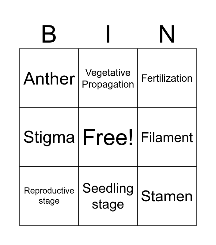 This bingo card has a free space and 16 words: Pollination, Seed formation, Fertilization, Anther, Budding, Vegetative Propagation, Fragmentation, Spore formation, Stamen, Filament, Carpel, Stigma, Style, Seedling stage, Reproductive stage and Vegetative stage.