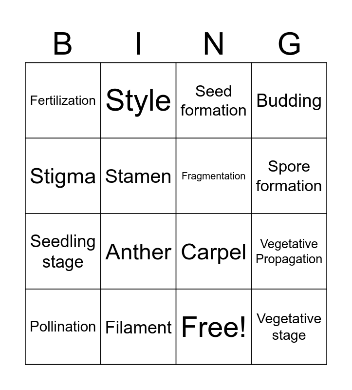 This bingo card has 17 words: Free!, Pollination, Seed formation, Fertilization, Anther, Budding, Vegetative Propagation, Fragmentation, Spore formation, Stamen, Filament, Carpel, Stigma, Style, Seedling stage, Reproductive stage and Vegetative stage.