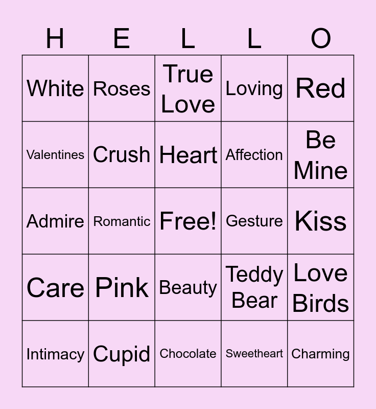 This bingo card has a free space and 24 words: Pink, Cupid, Heart, Intimacy, Red, White, Valentines, Roses, Gesture, Beauty, Affection, Admire, Teddy Bear, Love Birds, Crush, Sweetheart, Kiss, True Love, Be Mine, Romantic, Charming, Care, Loving and Chocolate.