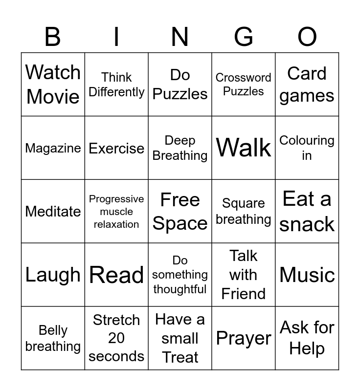 This bingo card has a free space and 24 words: Read, Stretch 20 seconds, Deep Breathing, Belly breathing, Card games, Watch Movie, Magazine, Think Differently, Square breathing, Do something thoughtful, Walk, Meditate, Talk with Friend, Music, Exercise, Prayer, Eat a snack, Do Puzzles, Colouring in, Progressive muscle relaxation, Ask for Help, Laugh, Crossword Puzzles and Have a small Treat.