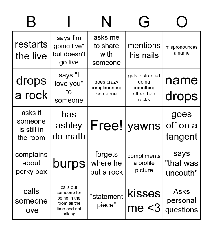 This bingo card has a free space and 24 words: burps, calls out someone for being in the room all the time and not talking, goes crazy complimenting someone, calls someone love, mispronounces a name, restarts the live, drops a rock, says I’m going live" but doesn't go live, yawns, forgets where he put a rock, gets distracted doing something other than rocks, asks if someone is still in the room, compliments a profile picture, says "that was uncouth", says "I love you" to someone, kisses me <3, goes off on a tangent, asks me to share with someone, name drops, has ashley do math, Asks personal questions, complains about perky box, mentions his nails and "statement piece".