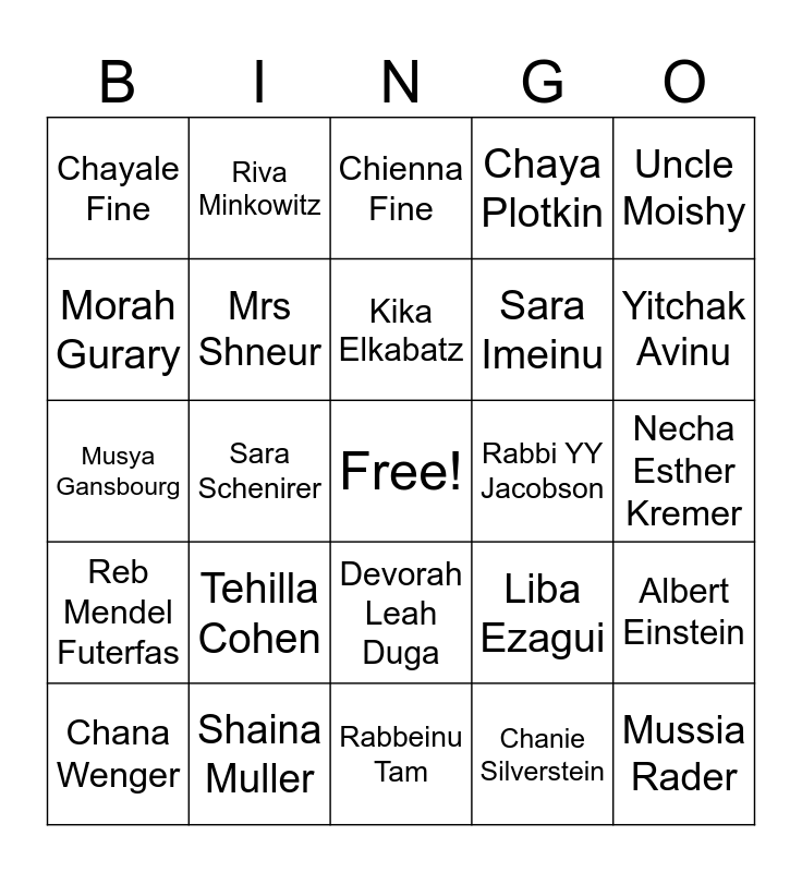 This bingo card has a free space and 24 words: Tehilla Cohen, Shaina Muller, Kika Elkabatz, Chana Wenger, Uncle Moishy, Chayale Fine, Morah Gurary, Riva Minkowitz, Rabbi YY Jacobson, Devorah Leah Duga, Sara Imeinu, Musya Gansbourg, Liba Ezagui, Albert Einstein, Mrs Shneur, Chanie Silverstein, Necha Esther Kremer, Chienna Fine, Yitchak Avinu, Sara Schenirer, Mussia Rader, Reb Mendel Futerfas, Chaya Plotkin and Rabbeinu Tam.