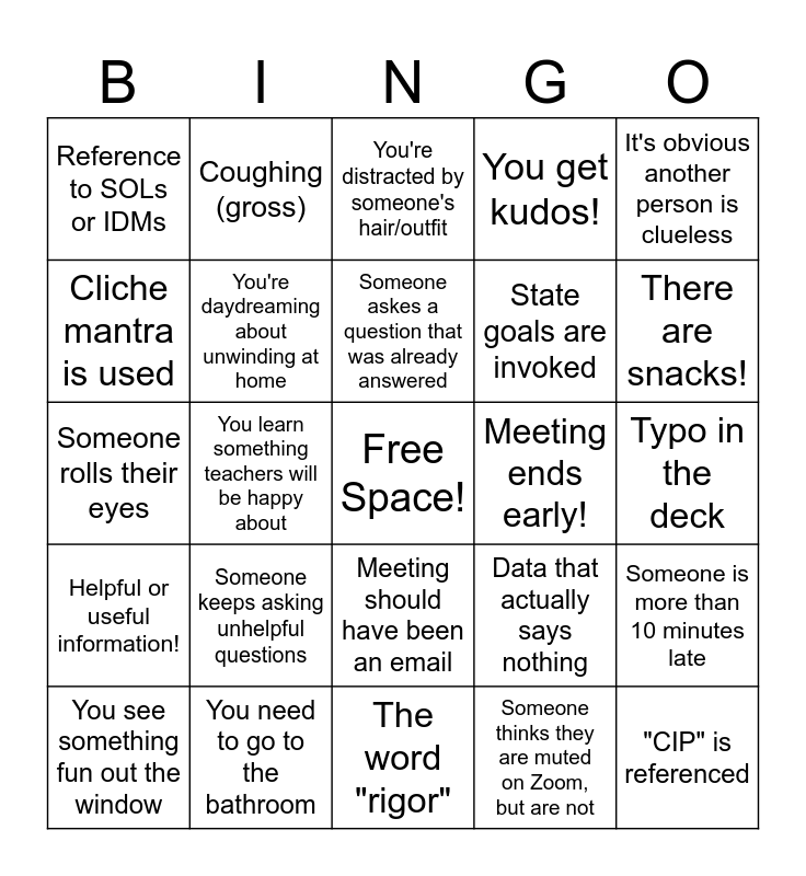 This bingo card has a free space and 44 words: You are called away for an emergency, "CIP" is referenced, You forgot your drink, You see something fun out the window, Someone is talking while muted in Zoom, Someone thinks they are muted on Zoom, but are not, You're distracted by someone's hair/outfit, You're asked to do something you already do, It's obvious another person is clueless, You need to go to the bathroom, You get kudos!, Meeting ends early!, Meeting should have been an email, Someone keeps asking unhelpful questions, A meme is used in the deck, The word "rigor", The word "relationship(s)", Someone rolls their eyes, A comment is made that is obviously directed at one person., There are snacks!, Coughing (gross), Seasoned veteran makes snarky comment, The words "self care", Reference to SOLs or IDMs, Someone refers to self in the third person, Typo in the deck, Someone is obviously doing other work, A graph or chart, Data that actually says nothing, Helpful or useful information!, A decision from the last meeting is changed, Someone is more than 10 minutes late, PD is discussed, You learn something teachers will not be happy about, You learn something teachers will be happy about, You get to deliver good news, Someone goes to the bathroom and does not return, Technical difficulties, Someone askes a question that was already answered, Cliche mantra is used, State goals are invoked, The words "student centered/driven", You're daydreaming about unwinding at home and 7-Steps or UDL mentioned.