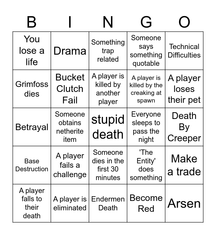 This bingo card has a free space and 24 words: A player fails a challenge, A player is eliminated, A player is killed by another player, A player falls to their death, Technical Difficulties, You lose a life, Grimfoss dies, Drama, Everyone sleeps to pass the night, Someone dies in the first 30 minutes, A player is killed by the creaking at spawn, Betrayal, 'The Entity' does something, Make a trade, Bucket Clutch Fail, Become Red, Death By Creeper, Something trap related, A player loses their pet, Someone obtains netherite item, Arsen, Base Destruction, Someone says something quotable and Endermen Death.