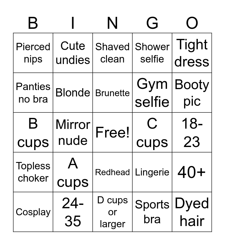 This bingo card has a free space and 24 words: A cups, 24-35, Brunette, Cosplay, Tight dress, Pierced nips, Panties no bra, Cute undies, C cups, Redhead, Gym selfie, B cups, Lingerie, 40+, Blonde, Sports bra, 18-23, Shaved clean, Booty pic, Mirror nude, Dyed hair, Topless choker, Shower selfie and D cups or larger.